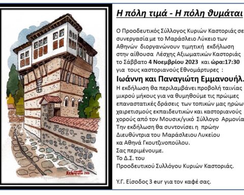 Καλούμε όλους τους καστοριανούς συντοπίτες μας να παρευρεθούν στην τιμητική εκδήλωσή μας , το Σάββατο 4 Νοεμβρίου και ώρα 5:30