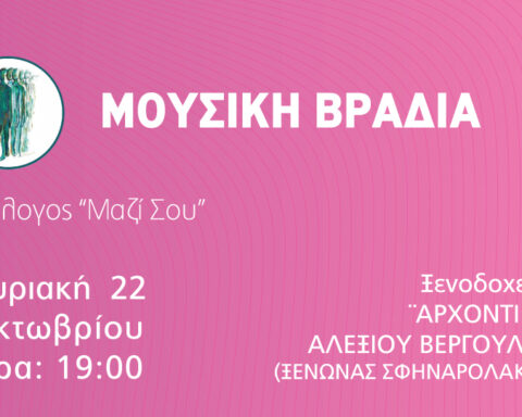 ΠερισσότεραΠΡΟΣΚΛΗΣΗ Μουσική Βραδιά για τον Καρκίνο του Μαστού 22 Οκτωβρίου 2023 Ο Σύλλογος Γονέων Παιδιών και Ενηλίκων με Νεοπλασματική