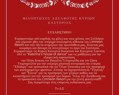 ΠερισσότεραΈνα πολύ όμορφο και ξεχωριστό Χριστουγεννιάτικο Απόγευμα, διοργάνωσε σήμερα στο Limneon Resort, η Φιλόπτωχος Αδελφότης Κυριών Καστοριάς. Οι παρευρεθέντες στη