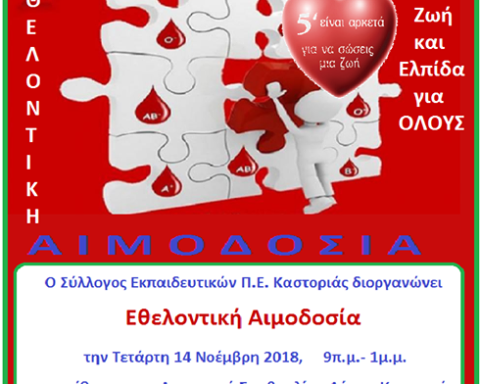 ΠερισσότεραΟ Σύλλογος Εκπαιδευτικών Π.Ε. Καστοριάς διοργανώνει εθελοντική αιμοδοσία την Τετάρτη 14 Νοεμβρίου 2018 στην αίθουσα του Δημοτικού Συμβουλίου Καστοριάς 9 π.μ.