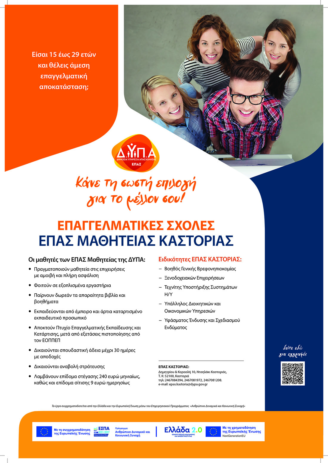 Μπες στο dypa.gov.gr/mathitia και βρες όλες τις πληροφορίες, για ειδικότητες, προγράμματα, μάθε για τις ΕΠΑΣ της ΔΥΠΑ που μπορούν να σου ανοίξουν το δρόμο για να εκπληρώσεις όσα οραματίζεσαι για το μέλλον σου.