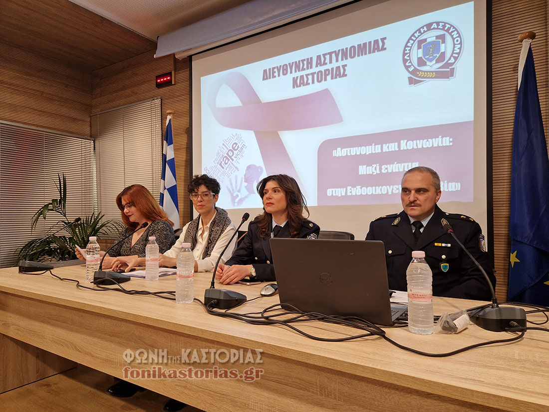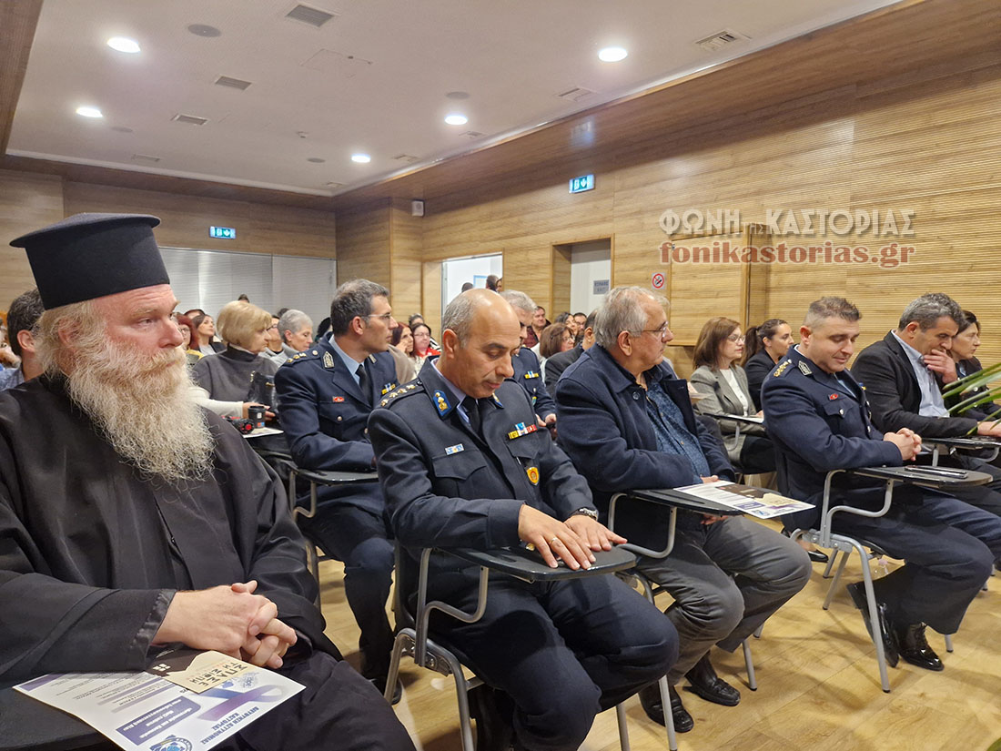 Μεταξύ των ομιλητών ήταν και ο προϊστάμενος του Γραφείου Αντιμετώπισης Ενδοοικογενειακής Βίας του Α.Τ Καστοριάς της Διεύθυνσης Αστυνομίας Καστοριάς, Αστυνόμος Α΄ Ευάγγελος Χάτσιος, ο οποίος αναφέρθηκε στο συγκεκριμένο γραφείο που λειτουργεί στο Αστυνομικό Τμήμα Καστοριάς από τον Ιούνιο του 2024.