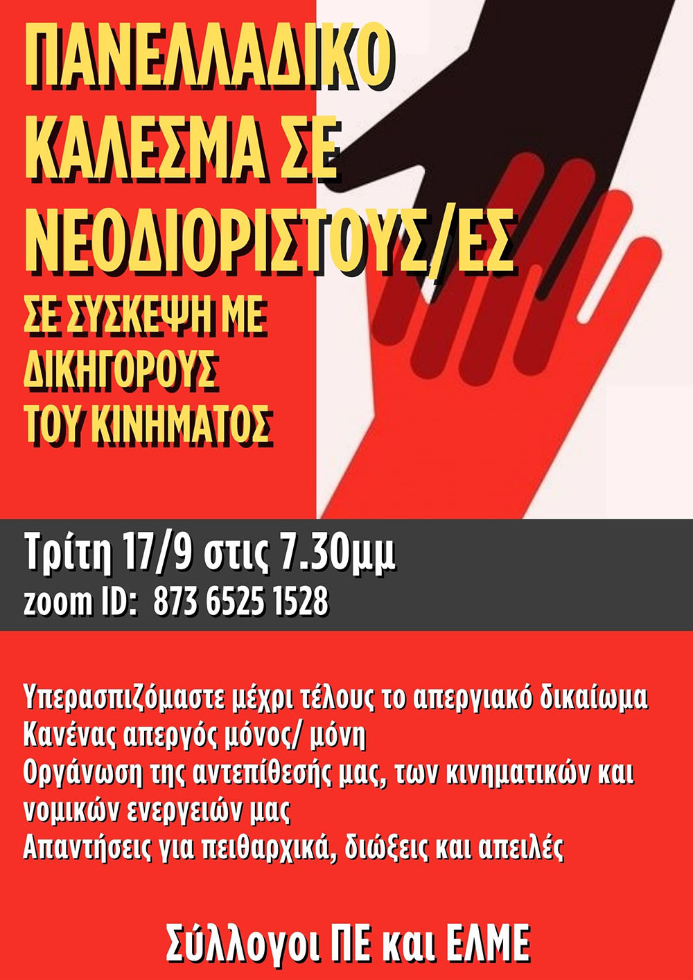 Καλούμε όλα τα εκπαιδευτικά σωματεία ΣΕΠΕ-ΕΛΜΕ να συμμετέχουν και να καλέσουν στην πανελλαδική σύσκεψη με τους δικηγόρους του κινήματος, καθώς και κάθε εκπαιδευτικό από όλη την χώρα να συνδεθεί και να συμμετέχει.