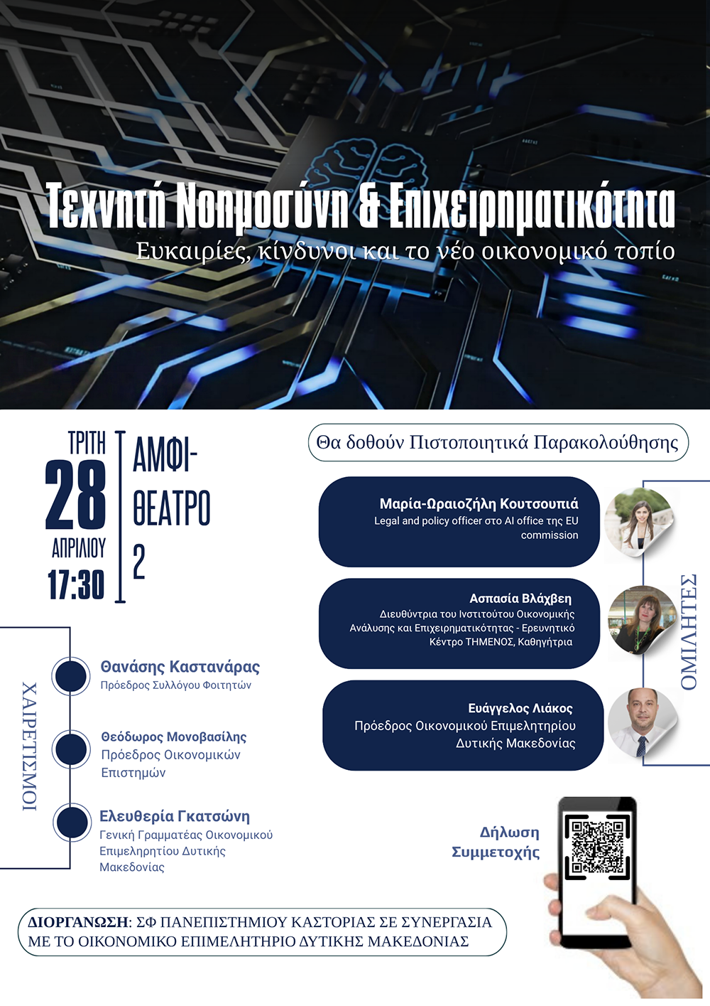 Ο Σύλλογος Φοιτητών Καστοριάς σε συνεργασία με το Οικονομικό Επιμελητήριο Δυτικής Μακεδονίας διοργανώνουν ημερίδα με θέμα “Τεχνητή Νοημοσύνη & Επιχειρηματικότητα”.