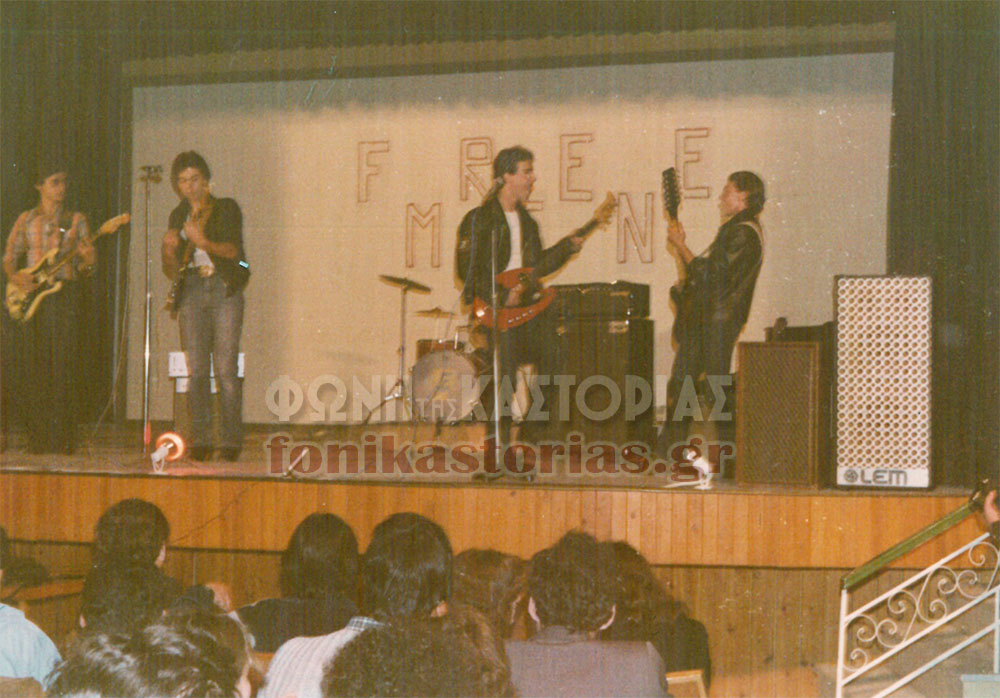 ΜΙΑ ΟΜΟΡΦΗ ΜΟΥΣΙΚΗ ΕΚΔΗΛΩΣΗ (15 Δεκεμβρίου 1979, αριθμός φύλλου 1682) Το βράδυ της Κυριακής στο Πνευματικό Κέντρο της Καστοριάς, από τη τελευταία τάξη του Γενικού Λυκείου μας δόθηκε συναυλία μουσικής «Ροκ» με τραγούδια της δεκαετίας του ’60 και του ’70 κυρίως, από το εκλεκτό νέο μουσικό συγκρότημα «FREE MEN», το οποίο καταχειροκροτήθηκε και αποθεώθηκε στη κυριολεξία από τη μαθητική και εξωσχολική νεολαία, όπου είχε κατακλύσει ασφυκτικά την αίθουσα και στις δύο παραστάσεις […] Ήταν πράγματι η συναυλία αυτή μια μουσική πανδαισία για τη νεολαία.