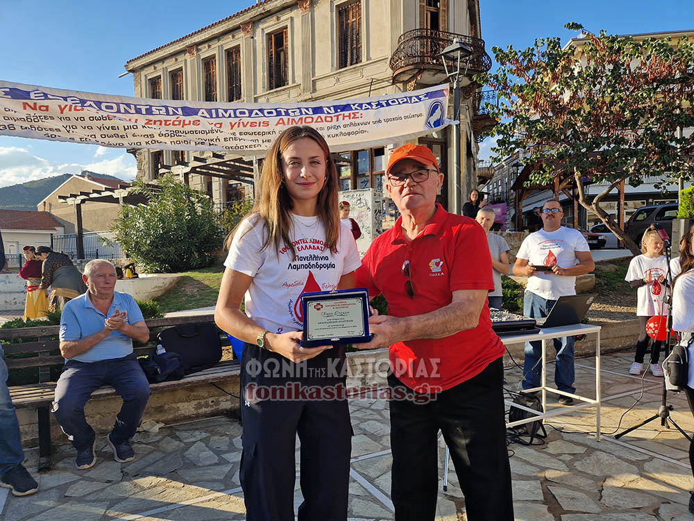 Στη συνέχεια, ο Σύλλογος Εθελοντών Αιμοδοτών Ν. Καστοριάς βράβευσε την ολυμπιονίκη και παγκόσμια πρωταθλήτρια κωπηλασίας Ευαγγελία Αναστασιάδου.