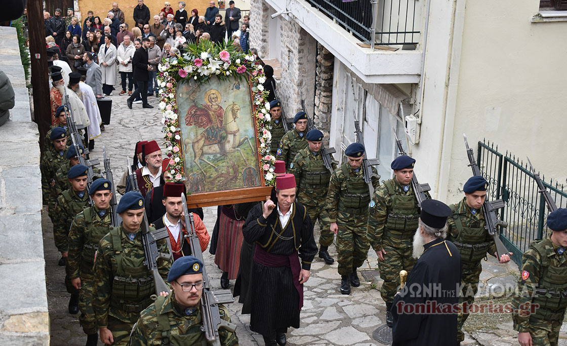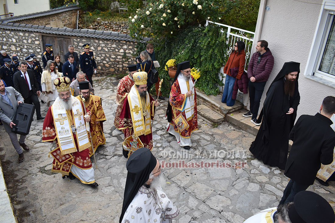 Στη συνέχεια πραγματοποιήθηκε Λιτάνευση της Ιερής Εικόνας του Αγίου και των Τιμίων λειψάνων Αυτού στον Μητροπολιτικό μας Ναό, όπου εκεί, παρουσία του υφ. Εθνικής Άμυνας Αθανάσιου Δαβάκη που εκπροσώπησε την Κυβέρνηση, του συμπατριώτη μας Αρχηγού ΓΕΣ Αντιστράτηγου Γεώργιου Κωστίδη, των λοιπών θρησκευτικών, πολιτικοστρατιωτικών αρχών και κόσμου, έγινε Έπαρση της Ελληνικής Σημαίας στην είσοδο του Ιερού Ναού και στη συνέχεια, τελέστηκε επίσημη Δοξολογία και εκφώνηση του πανηγυρικού της Ημέρας από τον Εκπαιδευτικό Νικόλαο Αλχασίδη, Δ/ντή του 1ου Δημ. Σχολείου Καστοριάς.