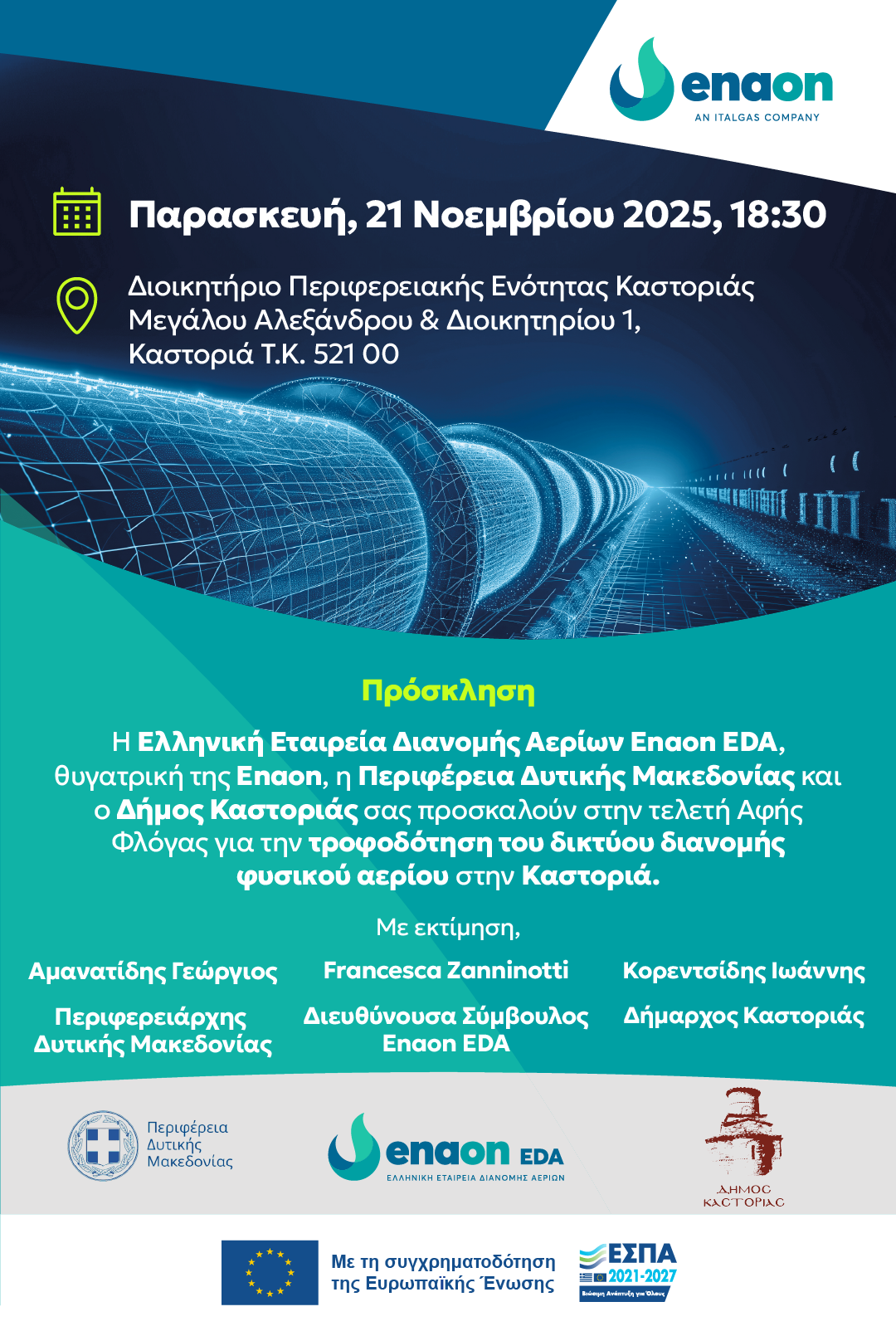 Οι κάτοικοι της Καστοριάς μπορούν να ενημερωθούν από στελέχη της Enaon EDA σχετικά με την επέκταση του δικτύου διανομής φυσικού αερίου στην περιοχή, καθώς και να λάβουν αναλυτικές πληροφορίες για τη διαδικασία σύνδεσης με το δίκτυο, την υποβολή αίτησης σύνδεσης και τη σύναψη σύμβασης σύνδεσης.