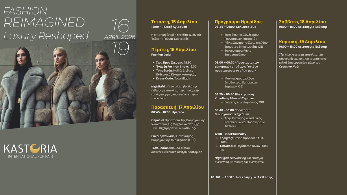 Την 51η Διεθνή Έκθεση Γούνας, μια διοργάνωση που αποτελεί κορυφαίο σταθμό για τον κλάδο της γουνοποιίας και σημείο αναφοράς για την παγκόσμια αγορά μόδας, ετοιμάζεται να φιλοξενήσει η Καστοριά από 16 έως 19 Απριλίου 2026.