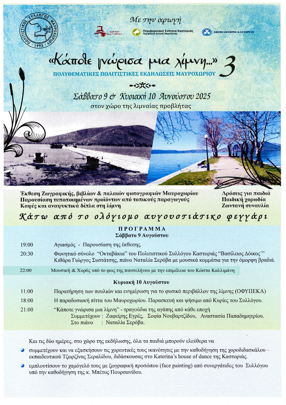 Για τρίτη συνεχόμενη χρονιά, ο Πολιτιστικός Σύλλογος Μαυροχωρίου “ἒμπνοος” διοργανώνει την την πολυθεματική – πολιτιστική εκδήλωση ” Κάποτε γνώρισα μια λίμνη… “