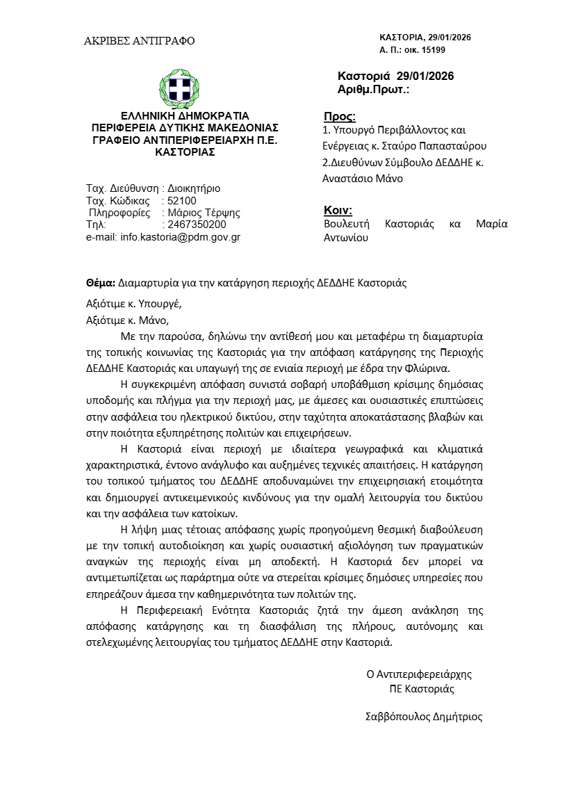 Επιστολή διαμαρτυρίας για την κατάργηση της Περιοχής ΔΕΔΔΗΕ Καστοριάς και την υπαγωγή της σε ενιαία περιοχή με έδρα τη Φλώρινα απέστειλε σήμερα, 29 Ιανουαρίου, ο Αντιπεριφερειάρχης Π.Ε. Καστοριάς, Δημήτρης Σαββόπουλος προς τον Υπουργό Περιβάλλοντος και Ενέργειας, Σταύρο Παπασταύρου και στον Διευθύνων Σύμβουλο ΔΕΔΔΗΕ, Αναστάσιο Μάνο, μεταφέροντας τη διαμαρτυρία της τοπικής κοινωνίας και ζητώντας την άμεση ανάκληση της απόφασης.