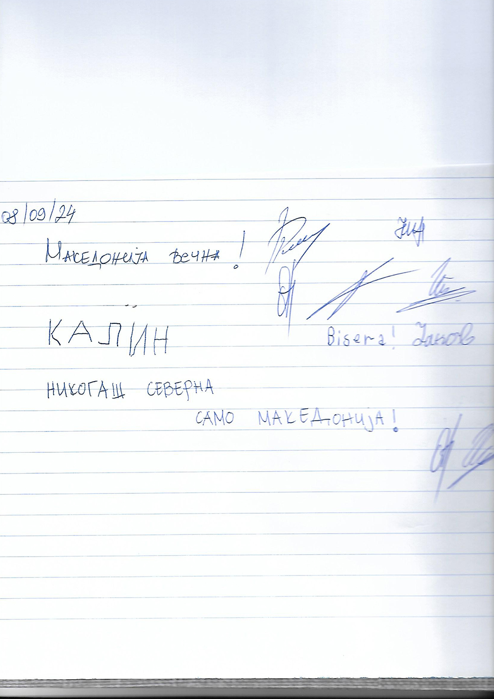 Τελευταία, οπότε μεγάλωσε ο αριθμός των τουριστών στην πόλη μας από τα Σκόπια, κάποιοι από αυτούς επισκέπτονται το Μουσείο μας, άλλοτε διατυπώνοντας προφορικά τις αντιρρήσεις τους κι άλλοτε, όπως σήμερα, 8/9/2024, γραπτά στο Βιβλίο Επισκεπτών μας. Θεωρούμε απαράδεκτο το γεγονός αυτό-εμείς ποτέ δε θα κάναμε κάτι αντίστοιχο σε δικό τους μουσείο-και αποφασίσαμε να το δημοσιοποιήσουμε, ώστε να γνωρίζουν όλοι οι συμπατριώτες μας κι όχι μόνον αυτοί ως πού φτάνει το θράσος τους: να μας επισκέπτονται και να δηλώνουν γραπτά στη γλώσσα τους:
