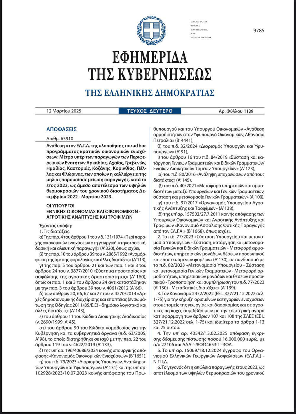 Δημοσιεύθηκε χθες (12/03/2025) στο ΦΕΚ (Β΄1139/12-03-225) η Κοινή Υπουργική Απόφαση των Υπουργών Αγροτικής Ανάπτυξης και Τροφίμων Κωνσταντίνου Τσιάρα και Εθνικής Οικονομίας και Οικονομικών Αθανασίου Πετραλιά, σύμφωνα με την οποία εντάσσονται σε ad hoc πρόγραμμα αποζημίωσης οι μηλοπαραγωγοί της Π.Ε. Καστοριάς, των οποίων η καλλιέργεια παρουσίασε μείωση παραγωγής, κατά το έτος 2023, ως άμεσο αποτέλεσμα των υψηλών θερμοκρασιών του χρονικού διαστήματος Δεκεμβρίου 2022 – Μαρτίου 2023.