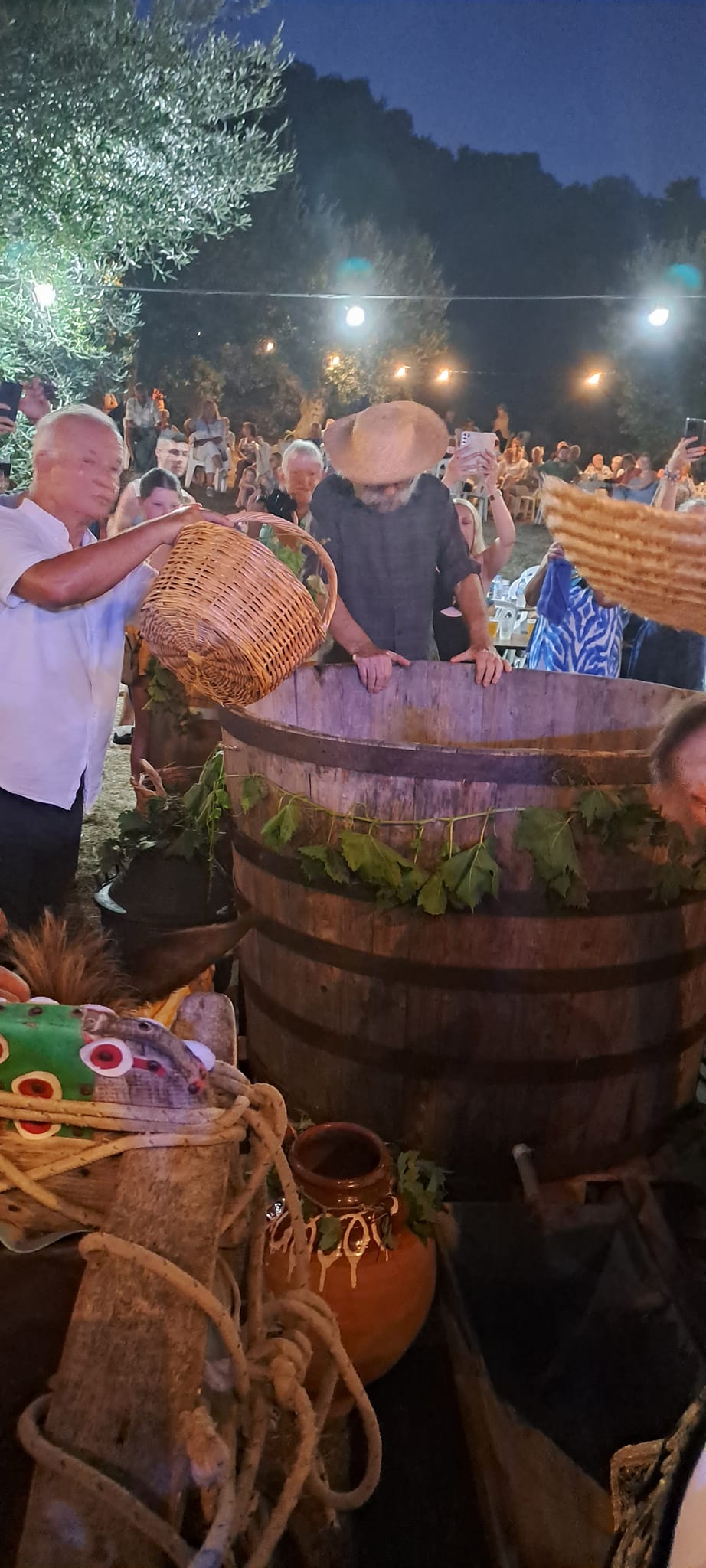 Ακολούθησε βιωματική αναπαράσταση του τρύγου, με πάτημα των σταφυλιών με τα πόδια, σε ξύλινο βαρέλι, σύμφωνα με τον πατροπαράδοτο τρόπο.