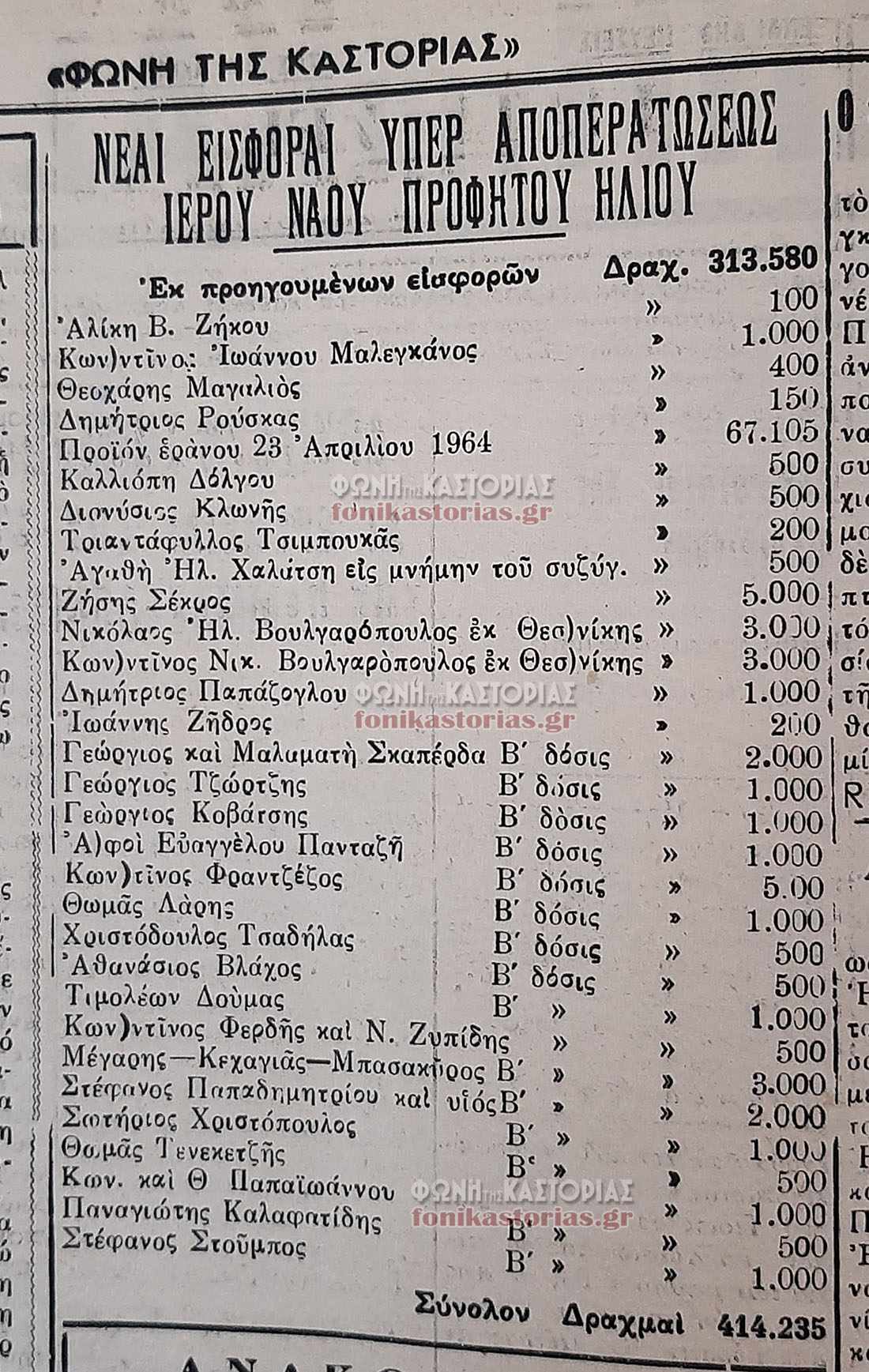 Από την εφημερίδα ΦΩΝΗ της Καστοριάς μάθαμε στα 1964 κάποιους από τους δωρητές εκείνης της περιόδου και τον Αριστείδη Αγγελίδη, ο οποίος είχε ρόλο πρωτεργάτη. Ακολουθούν τα ονόματά τους.