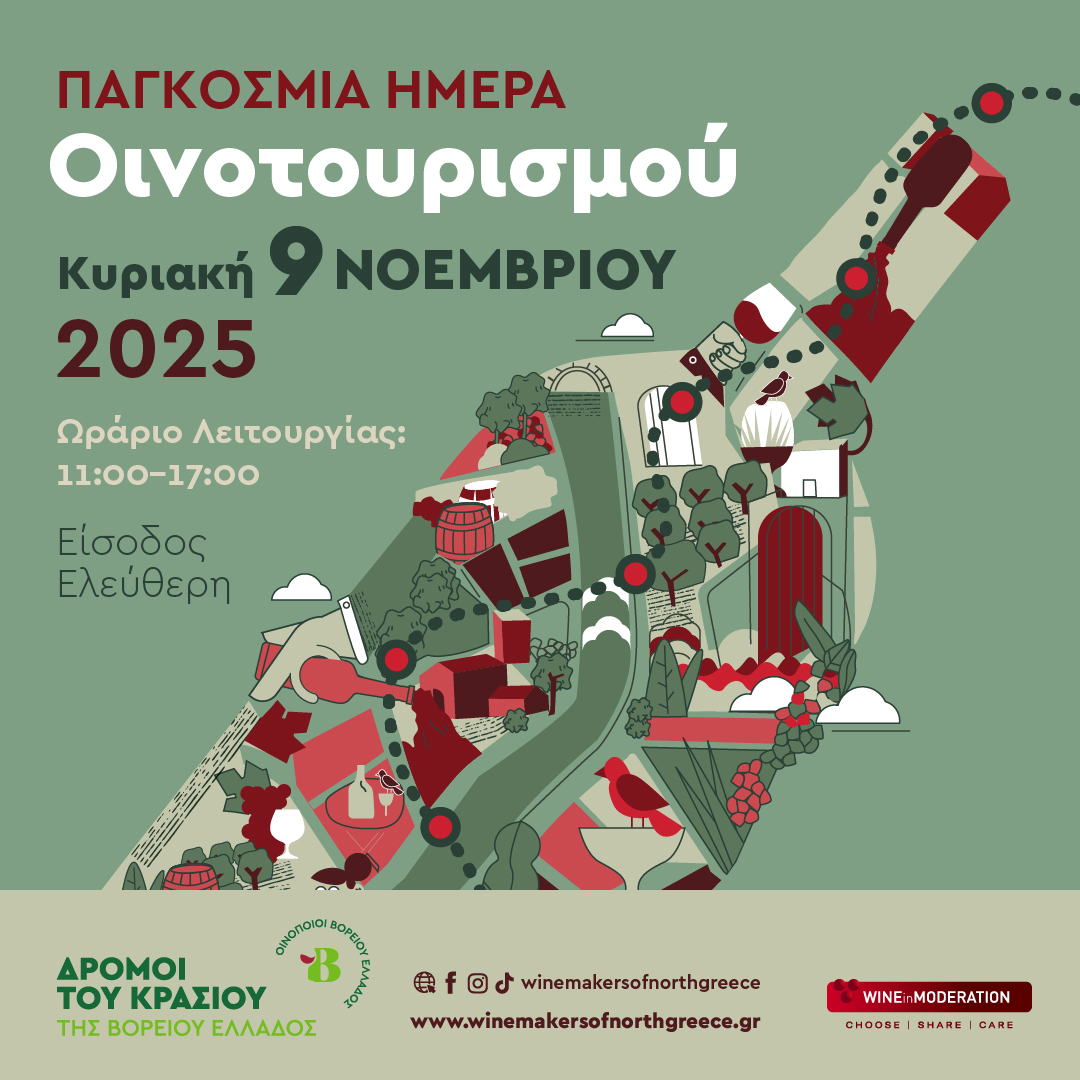 Την Κυριακή 9 Νοεμβρίου, το Κτήμα Στεργίου ανοίγει τις πόρτες του για να γιορτάσει μαζί σας την Παγκόσμια Ημέρα Οινοτουρισμού! Ανακαλύψτε την ομορφιά του φθινοπωρινού αμπελώνα μας, περιηγηθείτε στους χώρους παραγωγής, και ζήστε την ιστορία και την μαγεία της οινοποίησης.
