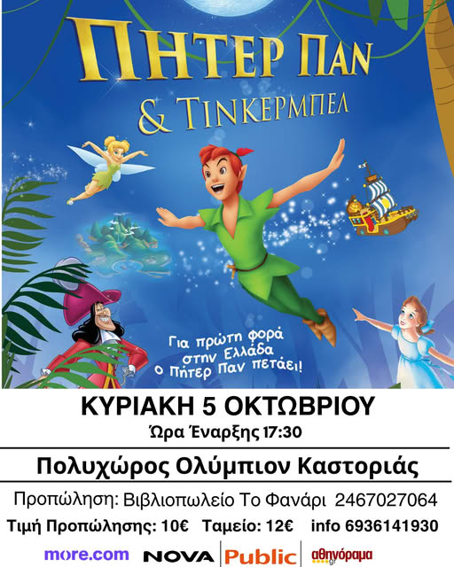 Η πιο διαδραστική παιδική παράσταση, παρουσιάζεται για πρώτη φορά, με τον Πήτερ Παν , την Τίνκερμπελ και την Γουέντυ να πετάνε ολοζώντανα μπροστά στους θεατές στoν Πολυχώρο Ολύμπιον στην Καστορία την Κυριακη 5 Οκτωβρίου και ώρα 17:30.