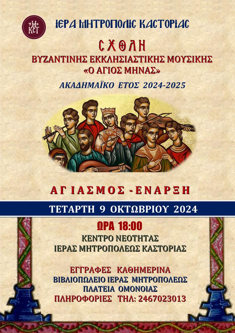 Η Ιερά Μητρόπολη Καστοριάς ανακοινώνει ότι το νέο διδακτικό έτος 2024 – 2025 της Σχολής Βυζαντινής Εκκλησιαστικής Μουσικής « O Άγιος Μηνάς » αρχίζει την 9η Οκτωβρίου ημέρα Τετάρτη και ώρα 6:00μ.μ. με την τέλεση του αγιασμού από τον Σεβασμιώτατο Μητροπολίτη μας κ.κ. Καλλίνικο στο κέντρο νεότητας της ιεράς Μητροπόλεως .
