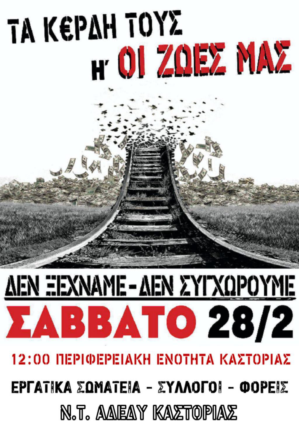 Το Νομαρχιακό Τμήμα Α.Δ.Ε.Δ.Υ. Καστοριάς καλείόλους τους πολίτες να συμμετέχουν μαζικά στο συλλαλητήριο στις 28Φεβρουαρίου ώστε να μην υπάρξει καμιά συγκάλυψη στο έγκλημα, στις αιτίες και τους αυτουργούς και να αποδοθεί ΔΙΚΑΙΟΣΥΝΗ.