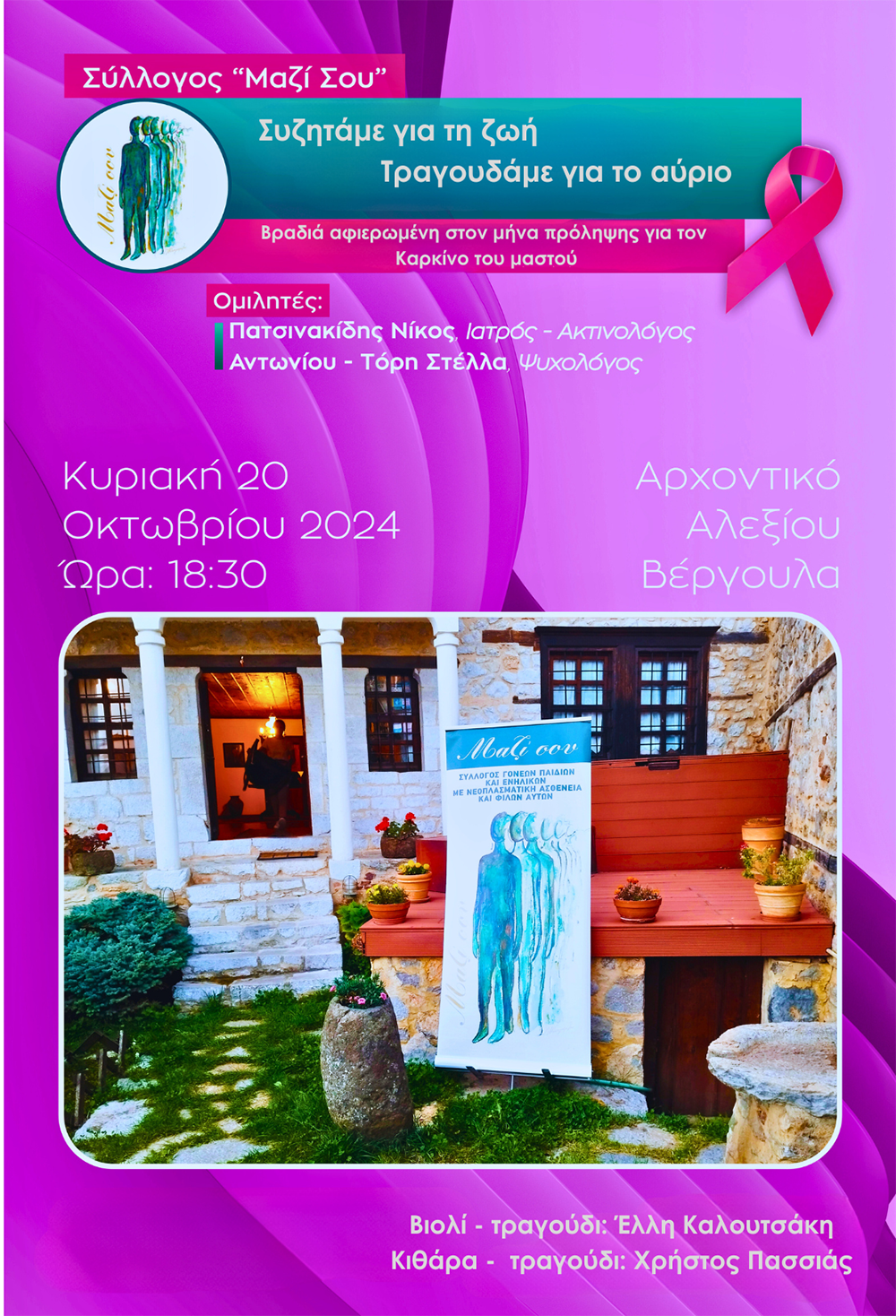 Σκοπός μας είναι, να βρεθούμε στον όμορφο χώρο του ξενοδοχείου ¨ΑΡΧΟΝΤΙΚΟ ΑΛΕΞΙΟΥ ΒΕΡΓΟΥΛΑ¨ να συζητήσουμε για την πρόληψη και την ψυχολογική στήριξη, να τραγουδήσουμε, για τη ζωή, τα υπέροχα τραγούδια που θα μας χαρίσουν οι μουσικοί μας και στο τέλος της βραδιάς να δούμε όλοι μας την επόμενη ημέρα πιο αισιόδοξη και φωτεινή.