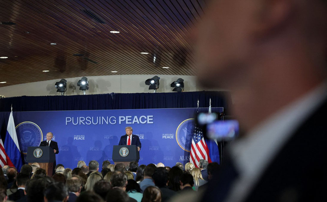 Ύστερα από σχεδόν τρεις ώρες συνομιλιών στην αεροπορική βάση Έλμεντορφ-Ρίτσαρντσον κοντά στο Άνκορατζ της Αλάσκας, οι δυο ηγέτες παραχώρησαν κοινή συνέντευξη Τύπου.