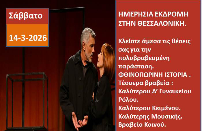 Ο Προοδευτικός Σύλλογος διοργανώνει ημερήσια εκδρομή στη Θεσσαλονίκη το Σάββατο 14 Μαρτίου για να παρακολουθήσουμε στο