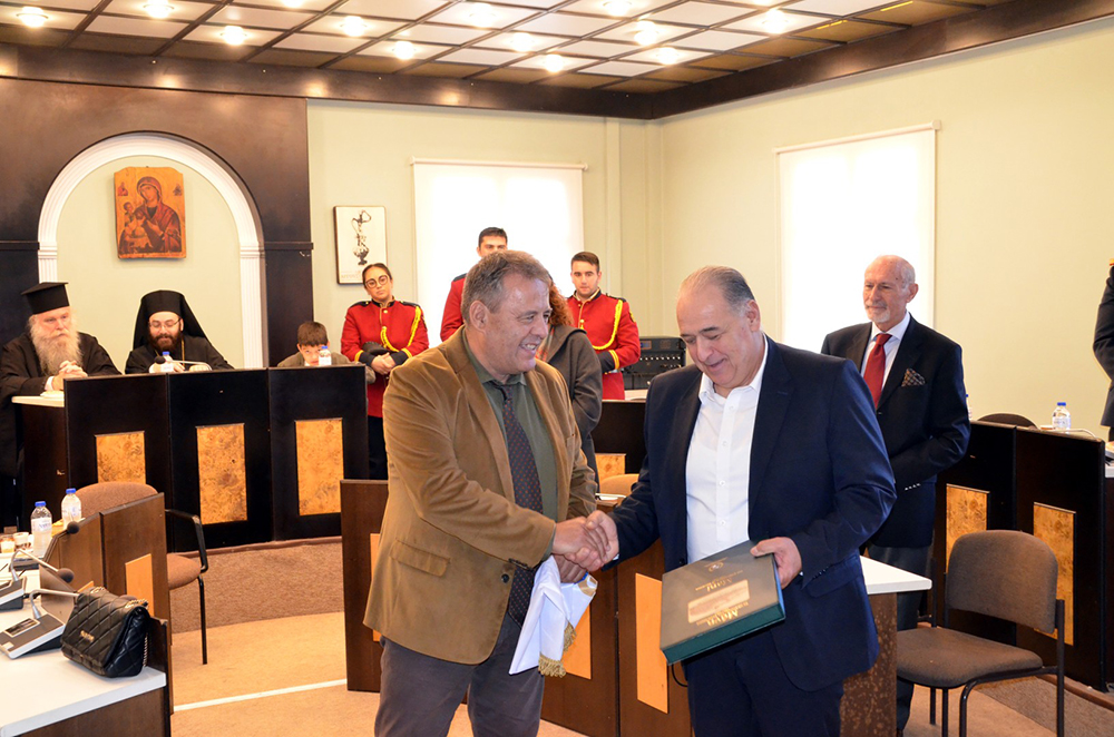 Στο τέλος της ομιλίας του, προσέφερε εκ μέρους του Δημάρχου Ανατολικής Μάνης κ. Πέτρου Ανδρεάκου ένα βιβλίο για την ιστορία της Μάνης, καθώς και μία σημαία με το σύνθημα «ΝΙΚΗ Ή ΘΑΝΑΤΟΣ», ως σύμβολα της λεβεντιάς και της αδιάκοπης πίστης των Ελλήνων στην ελευθερία.