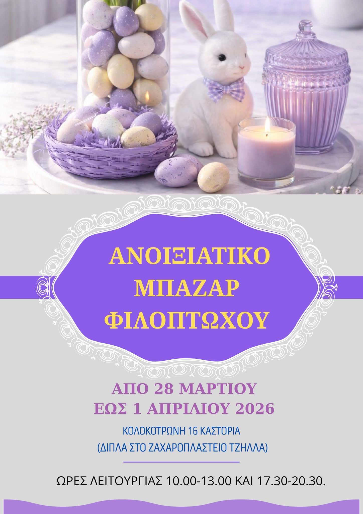Από την Παρασκευή 28 Μαρτίου 2026 έως και την Τετάρτη 1 Απριλίου 2026 στην οδό Κολοκοτρώνη16 (δίπλα στο ζαχαροπλαστείο Τζήλλας).