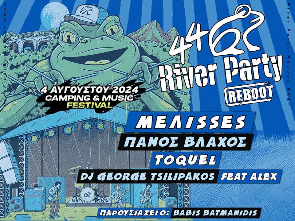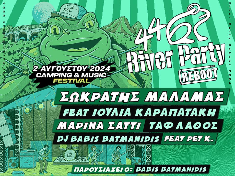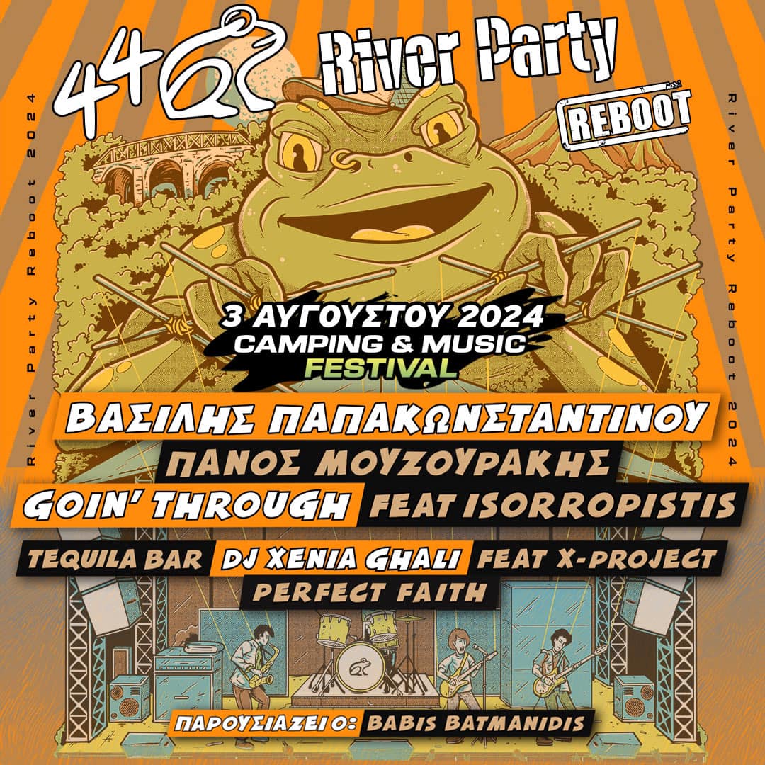 Μαγικές διακοπές και κατασκήνωση δίπλα στο ποτάμι με ζωντανή μουσική, κέφι, και ατελείωτο χορό μέχρι τις πρωινές ώρες. Σας περιμένουμε και φέτος, στην 44η (!!) έκδοση του River Party, για να δημιουργήσουμε αναμνήσεις και να γράψουμε ιστορία. Το line-up μας φέτος είναι με διαφορά το καλύτερο που έχει γίνει ποτέ: