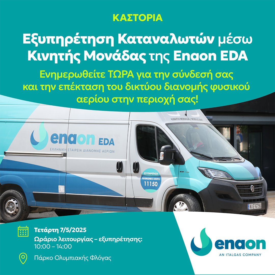 Η Enaon EDA, Ελληνική Εταιρεία Διανομής Αερίων, θυγατρική της Enaon, ανακοινώνει ότι η κινητή μονάδα εξυπηρέτησης καταναλωτών θα βρίσκεται στην Καστοριά, για την εξυπηρέτηση των κατοίκων που ενδιαφέρονται να συνδεθούν με το δίκτυο διανομής φυσικού αερίου.