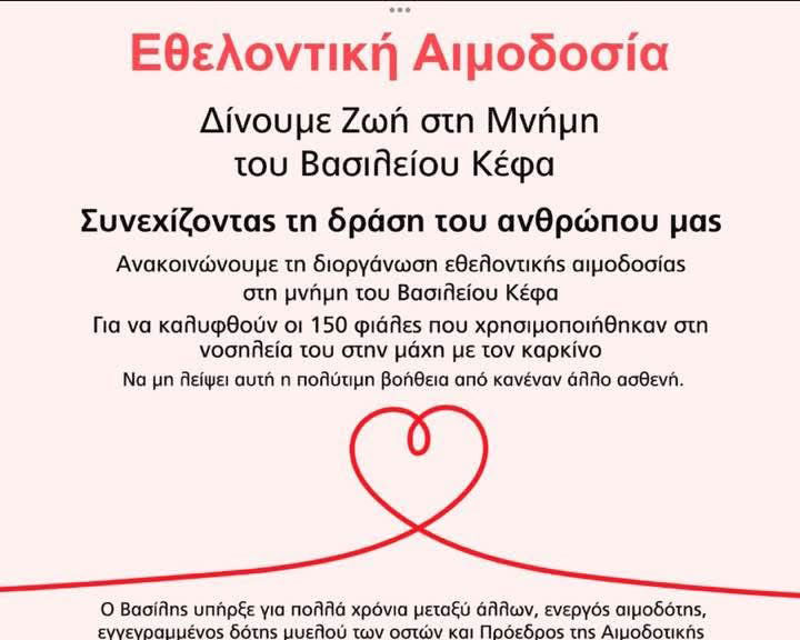 Εθελοντική Αιμοδοσία “Δίνουμε Ζωή στη Μνήμη του Βασιλείου Κέφα”